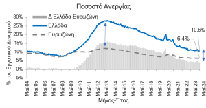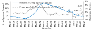 Σύμφωνα με τη μηνιαία έρευνα εργατικού δυναμικού της Ελληνικής Στατιστικής Αρχής (ΕΛΣΤΑΤ), το εποχικά διορθωμένο ποσοστό ανεργίας διαμορφώθηκε στο 10,6% του εργατικού δυναμικού τον Μαϊ-24 από 10,7% τον Απρ-24 και 11,2% τον Μαϊ-23. Δηλαδή, η «φωτογραφική» απεικόνιση της ελληνικής αγοράς εργασίας τον Μαϊ-24 δείχνει ότι για κάθε 100 άτομα που ανήκουν στο εργατικό δυναμικό ( = απασχολούμενοι + άνεργοι) περίπου 10 με 11 δεν εργάζονται αλλά αναζητούν εργασία. Ανάμεσα στις χώρες της Ευρωπαϊκής Ένωσης των 27 κρατών μελών (ΕΕ-27) η Ισπανία εμφάνισε το υψηλότερο ποσοστό ανεργίας με 11,7% και ακολούθησαν (εξαιρουμένων των οικονομιών της Ιρλαν- δίας και του Λουξεμβούργου): Ελλάδα (10,6%), Φινλανδία (8,2%), Σουηδία (8,2%), Λιθουανία (7,7%), Εσθονία (7,4%), Γαλλία (7,4%), Ιταλία (6,8%), Λετονία (6,7%), Πορτογαλία (6,5%), Ευρωζώνη (6,4%), ΕΕ-27 (6,0%), Βέλγιο (5,9%), Δανία (5,8%), Σλοβακία (5,5%), Ρουμανία (5,4%), Κροατία (5,3%), Αυστρία (5,0%), Βουλγαρία (4,4%), Ουγγαρία (4,3%), Κύπρος (4,1%), Ολλανδία (3,6%), Γερμανία (3,3%), Μάλτα (3,2%), Σλοβενία (3,2%), Πολωνία (3,0%) και Τσεχία (2,7%). Όπως παρουσιάζεται στο Σχήμα 1, η μεγάλη απόκλιση σε όρους ποσοστού ανεργίας ανάμεσα στην ελληνική οικονομία και τους μέ- σους όρους της ΕΕ-27 και της Ευρωζώνης μειώθηκε σημαντικά τα 10 τελευταία χρόνια, εντούτοις, εξακολουθεί να είναι υψηλή αναδεικνύοντας την ύπαρξη δομικών προβλημάτων στην ελληνική α- γορά εργασίας (π.χ. αναντιστοιχίες ανάμεσα στη ζήτηση εργασίας εκ μέρους των επιχειρήσεων και την προσφορά εργασίας εκ μέρους των νοικοκυριών).