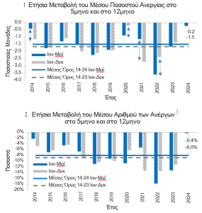Στο 5μηνο Ιαν-Μαϊ-24 το μέσο ποσοστό ανεργίας στην Ελλάδα διαμορφώθηκε στο 11,0% του εργατικού δυναμικού παρουσιάζοντας ελαφρά πτώση κατά 0,2 ποσοστιαίες μονάδες σε σύγκριση με το αντίστοιχο διάστημα πέρυσι. Όπως παρουσιάζεται στο Σχήμα 2.1, ο ετήσιος ρυθμός πτώσης του μέ- σου ποσοστού ανεργίας στο 5μηνο Ιαν-Μαϊ-24 ήταν ο μικρότερος από όλα τα αντίστοιχα 5μηνα των τελευταίων 10 ετών. Επιπρόσθετα, με εξαίρεση το 2014 -έτος στο οποίο ξεκίνησε η μείωση του ποσοστού ανεργίας- και την 3ετία 2020-2022 (ισχυρές επιδράσεις από την πανδημία), σε όλα τα υπόλοιπα έτη, ήτοι το 2015, το 2016, το 2017, το 2018, το 2019 και το 2023, η μέση ετήσια πτώση του ποσοστού ανεργίας στο 5μηνο Ιαν-Μαϊ ήταν πολύ κοντά στο τελικό μέγεθος για το σύνολο του έτους. Αυτό το στοιχείο αποτελεί μια ένδειξη ότι το ποσοστό ανεργίας το 2024 ίσως μειωθεί βραδύτερα σε ετήσια βάση σε σύγκριση με τα προηγούμενα έτη, κάτι που αποτυπώνεται και στις τρέχουσες εκτιμή- σεις επίσημων οργανισμών.