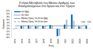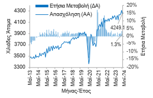 Απασχόληση (σύνολο οικονομίας): +1,3% YoY τον Μαϊ-24 από +3,4% YoY τον Απρ-24, +1,5% YoY την περίοδο Μαϊ-23 – Απρ-24 (12Μ) από +2,1% YoY την περίοδο Ιουν-22 – Μαϊ-23.