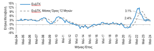 Τον Μάιο 2024 η ετήσια μεταβολή του ΕνΔΤΚ ήταν +2,4% YoY (+3,2% YoY τον Απρίλιο 2024 και +4,1% YoY τον Μάιο 2023)) και η αντίστοιχη μέση ετήσια μεταβολή (μέσος όρος 12 μηνών) ήταν 3,1% YoY (3,3% YoY τον Απρίλιο 2024 και 8,2% YoY τον Μάιο 2023).