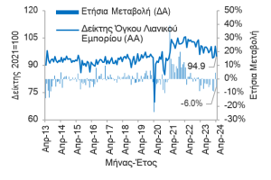 Δείκτης Όγκου Λιανικού Εμπορίου: -5,7% MoM και -6,0% YoY τον Απρ-24 από +6,3% MoM και +4,7% YoY τον Μαρ-24, -4,0% YoY την περίοδο Μαϊ-23 – Απρ-24 (12Μ) από -0,9% YoY την περίοδο Μαϊ-22 – Απρ-23.
