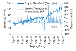 Δείκτης Παραγωγής Μεταποίησης: +5,5% MoM και +10,3% YoY τον Απρ-24 από -3,2% MoM και -2,2% YoY τον Μαρ-24, +3,2% YoY την περίοδο Μαϊ-23 – Απρ-24 (12Μ) από +5,6% YoY την περίοδο Μαϊ-22 – Απρ-23