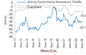 Δείκτης Εμπιστοσύνης Καταναλωτή: -42,7 ΜΔ τον Ιουν-24, +1,1 ΜΔ ΜοΜ και -11,7 ΜΔ YoY τον Μαϊ-24 από -2,1 ΜΔ ΜοΜ και -9,3 ΜΔ YoY τον Μαϊ- 24.