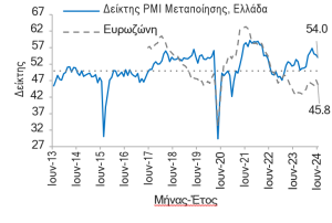 Δείκτης PMI Μεταποίησης: 54,0 ΜΔ τον Ιουν-24, -0,9 ΜΔ ΜοΜ και +2,2 ΜΔ YoY τον Μαϊ-24 από -0,3 ΜΔ ΜοΜ και +3,4 ΜΔ YoY τον Μαϊ-24.