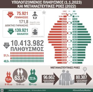 Εξάλλου, από τα δημογραφικά στοιχεία για το 2022 της ΕΛΣΤΑΤ προκύπτει υστέρηση γεννήσεων (75.921) έναντι θανάτων (139.921) και δείκτης γήρανσης 171,8 (άτομα 65 ετών και άνω έναντι παιδιών έως 14 ετών – άνω των 65 ετών είναι το 22,9% του πληθυσμού). Ας συνεκτιμηθούν και οι αυξανόμενες μεταναστευτικές ροές, που για την Ελλάδα πλησιάζουν τις 100 χιλιάδες ετησίως, οι οποίες αξιολογούνται δυνητικά και μόνο για εργατικό δυναμικό με θεωρητικά απλοποιημένη την αφομοίωση των -νομίμων, εννοείται- μεταναστών ως πολιτών σε βάθος χρόνου, ενώ είναι άλυτα τα θέματα ένταξης με διασφάλιση της κοινωνικής συνοχής.